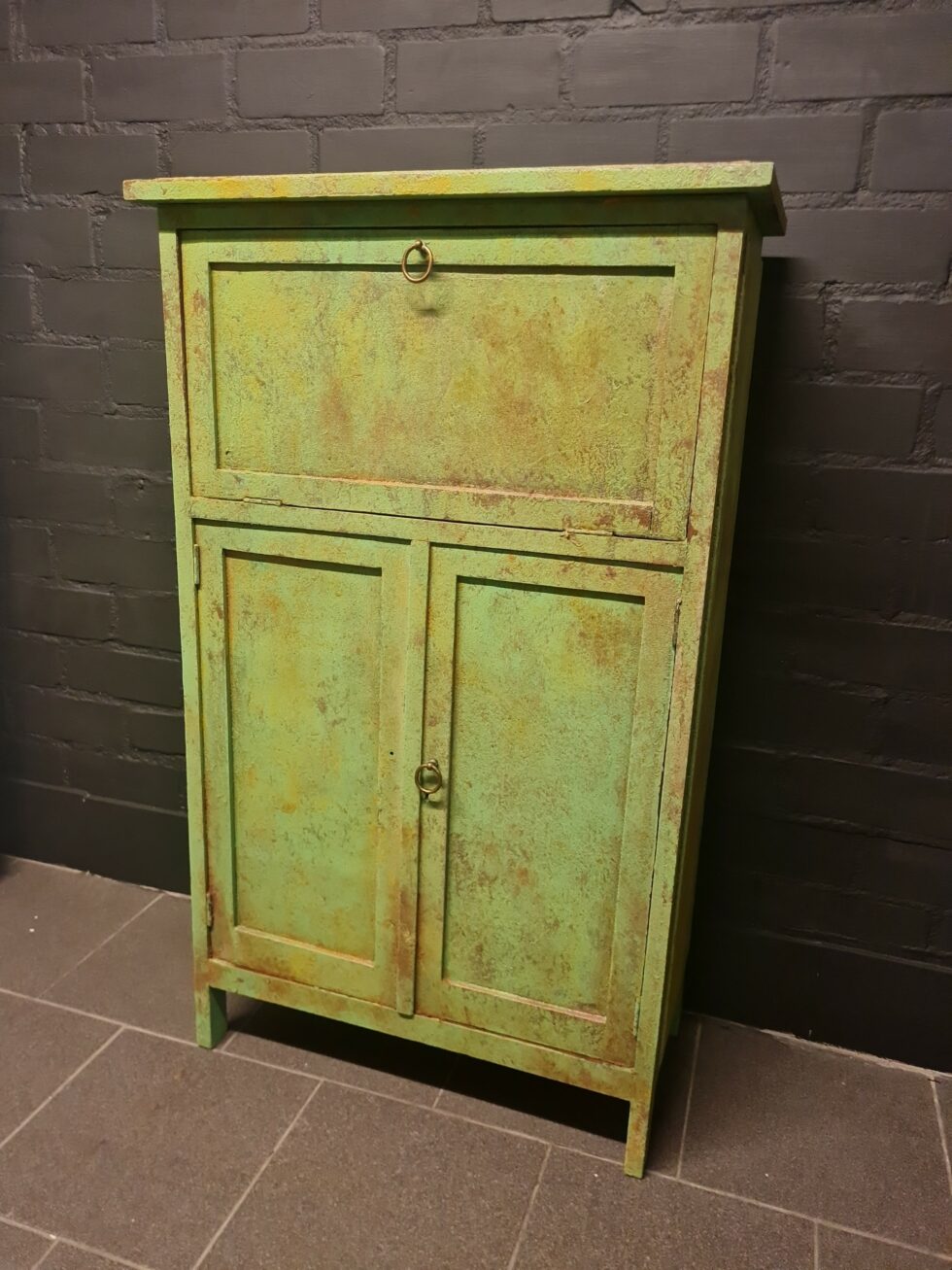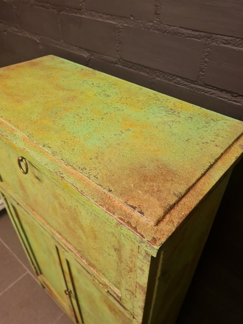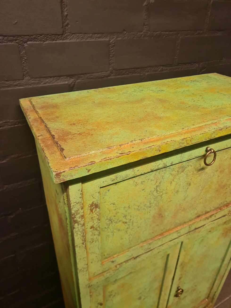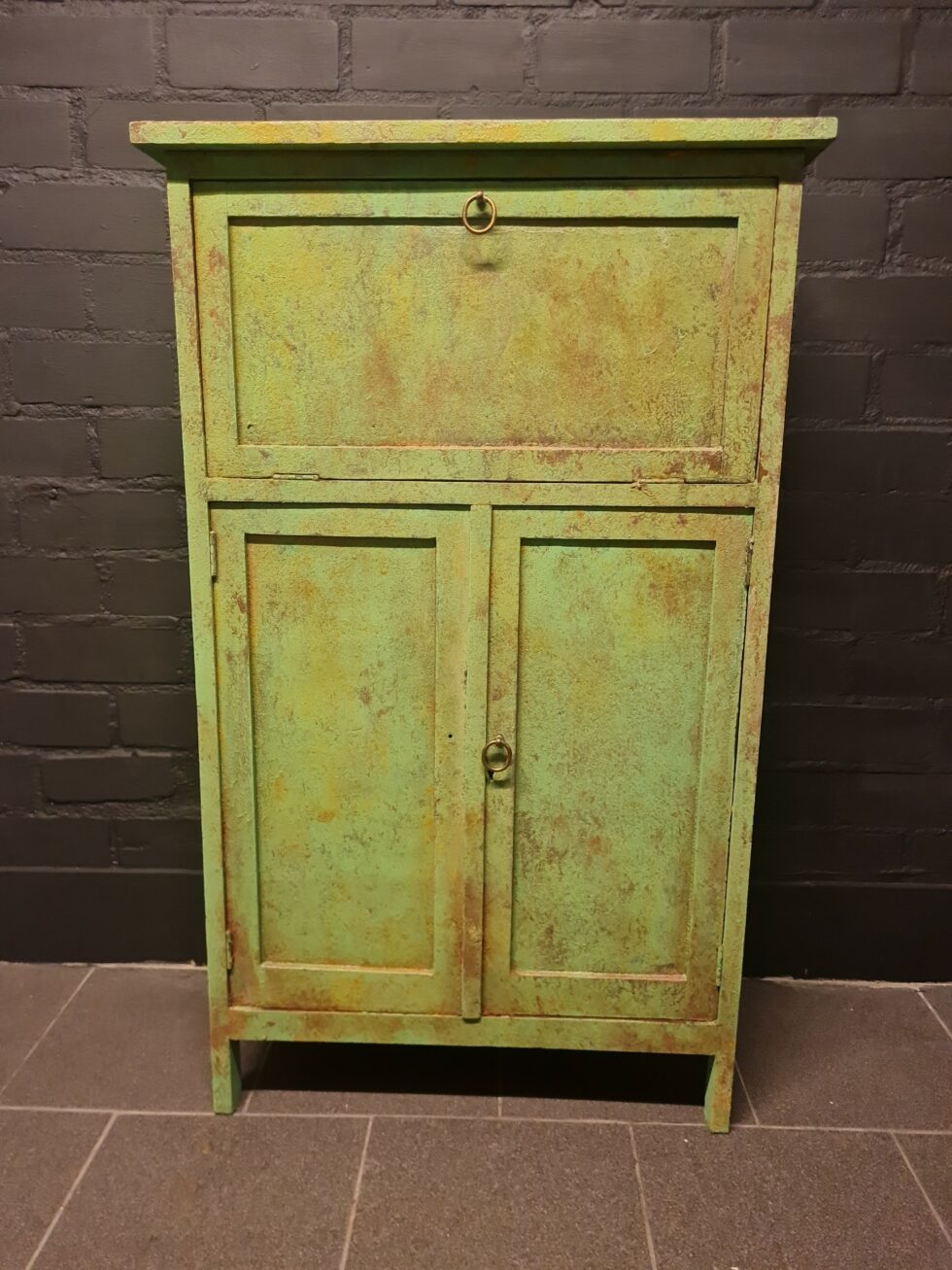 De basis is een mooie Antibe groene kleur wat het kastje een authentieke vintage metalen vibe geeft.