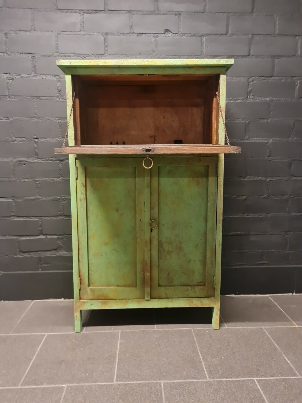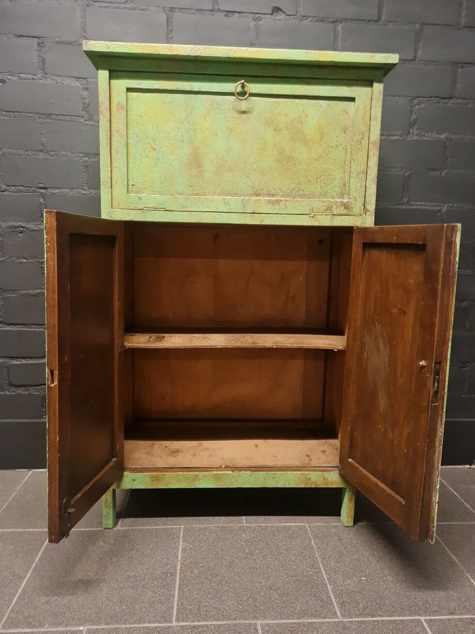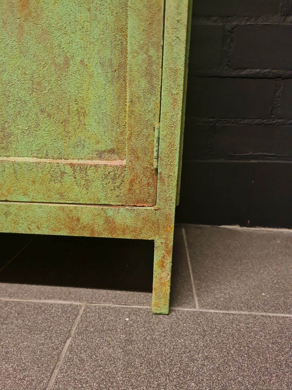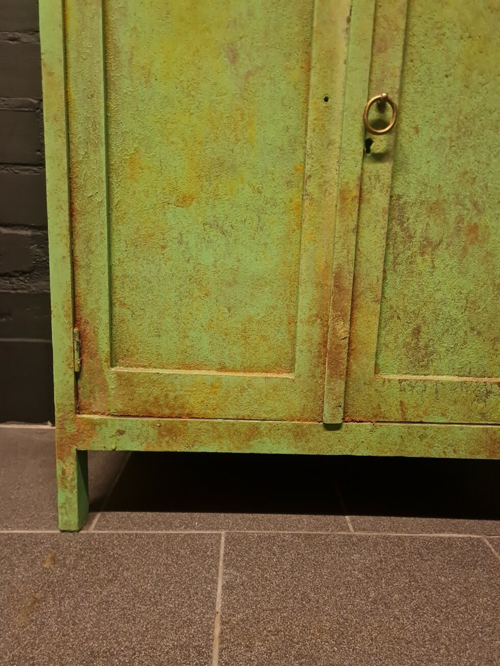 De basis is een mooie Antibe groene kleur wat het kastje een authentieke vintage metalen vibe geeft.