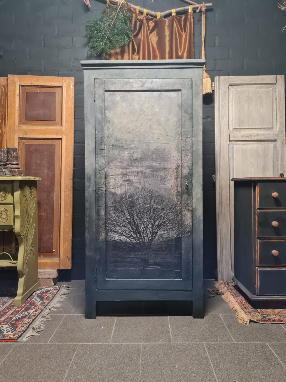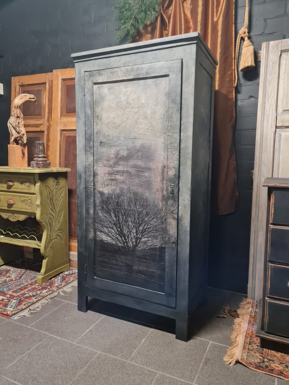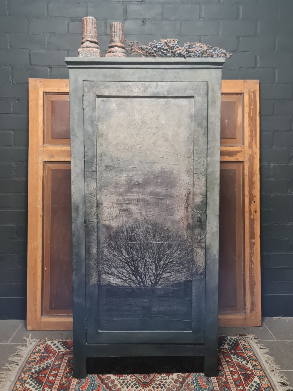 Deze prachtige, handbeschilderde kast is een echt pronkstuk! Het subtiele ontwerp met een schilderachtige boomprint straalt vakmanschap uit. De rustieke kleurencombinatie van grijs, zwart, taupe en mosgroen maakt deze kast een stijlvolle en stoere toevoeging aan elk interieur.